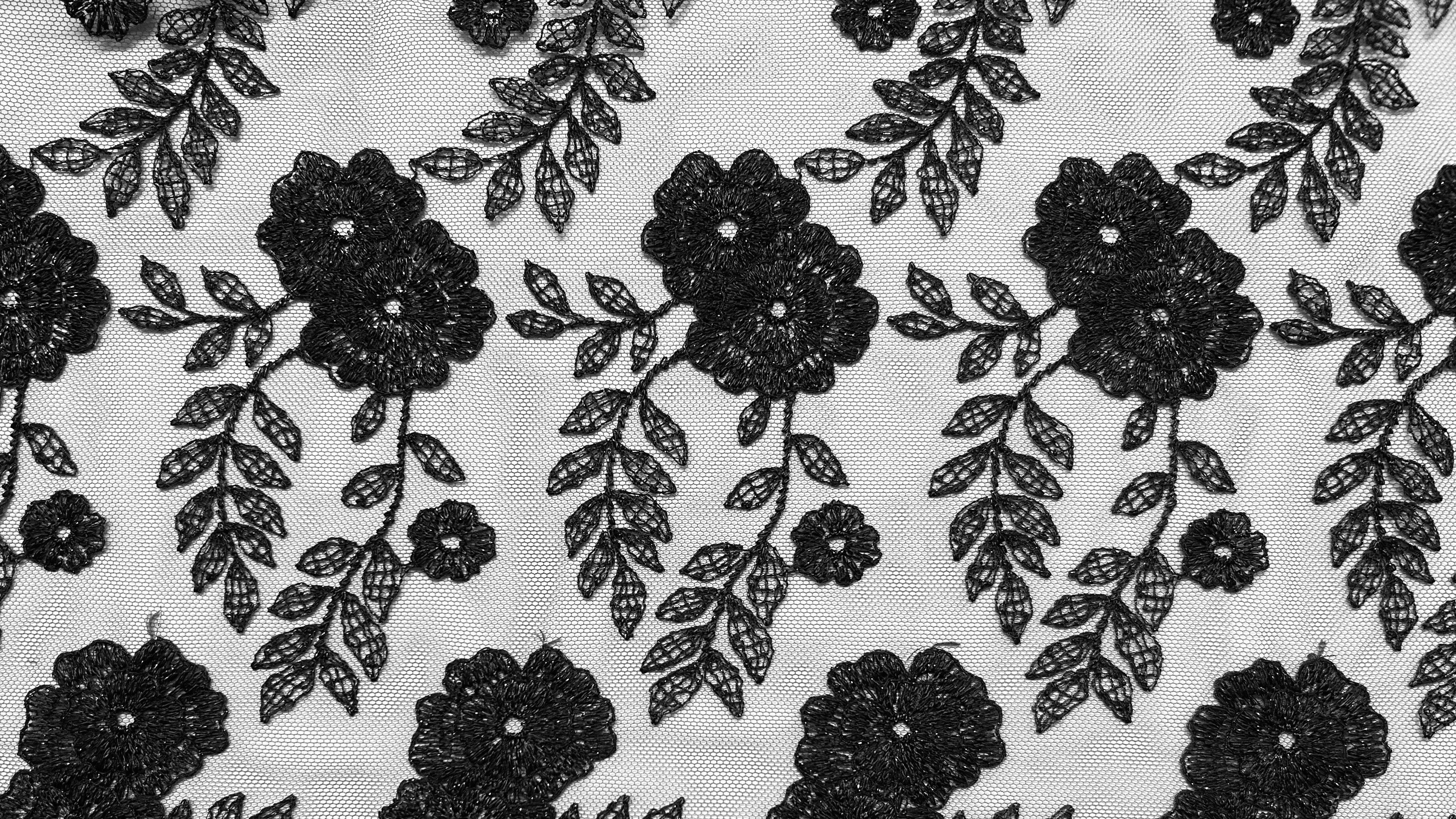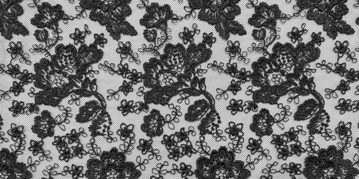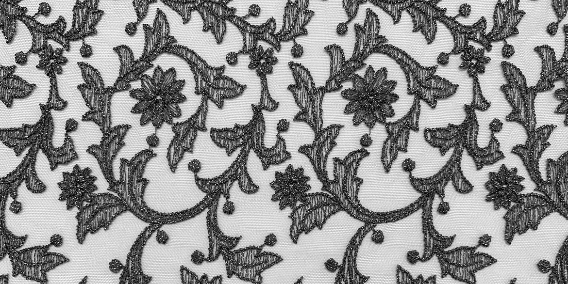 オールドフラワーモチーフを高度なステッチ技術で表現したレースです。繊細なチュール素材に立体感のあるラメレースが施され、メタルのようなインパクトを与えます。強くワイルドなデザインですが、女性の身体に纏うことで、魅惑的で官能的な色気を感じさせます。