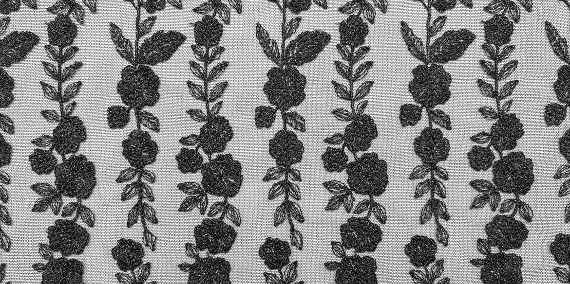 咲き乱れた花がツルに沿ってに伸びていく様を美しいストライプ柄で表現しました。儚げで繊細なステッチワークと上品な光を放つラメ糸で作った高級なチュールレースです。レトロでセンシュアルな雰囲気を持ちながら、モダンな印象に仕上げています。