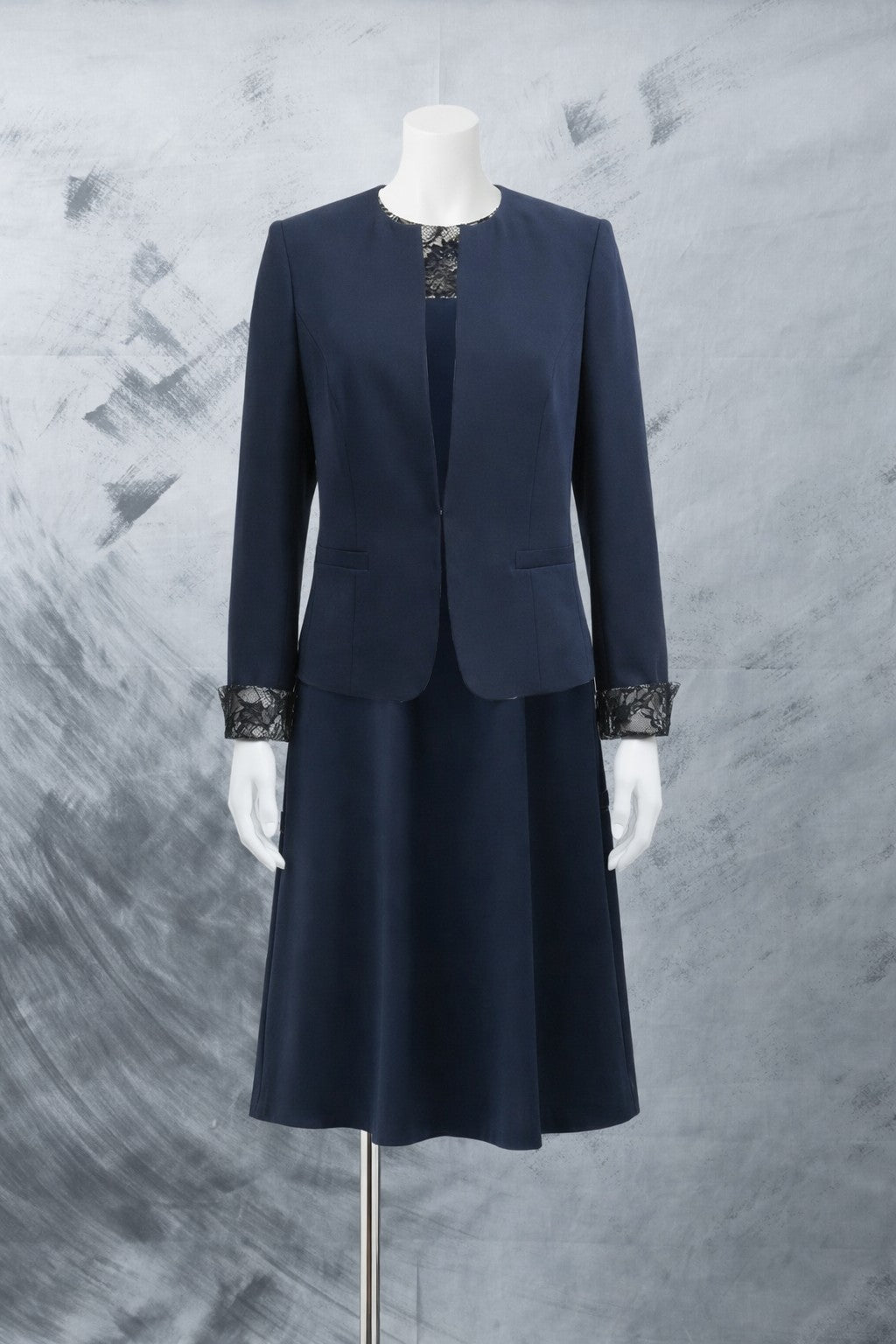 同素材のドレスはデコルテにあしらった繊細なレースは、主張しすぎることなく、凛とした華やぎを添えます。光を受けるたびにほのかに煌めくラメ糸が、フォーマルな場にふさわしい上品な存在感を演出。袖は腕を見せ過ぎない設計。気になる部分をやわらかく包み込みながら、女性らしいラインを美しく引き立てます。