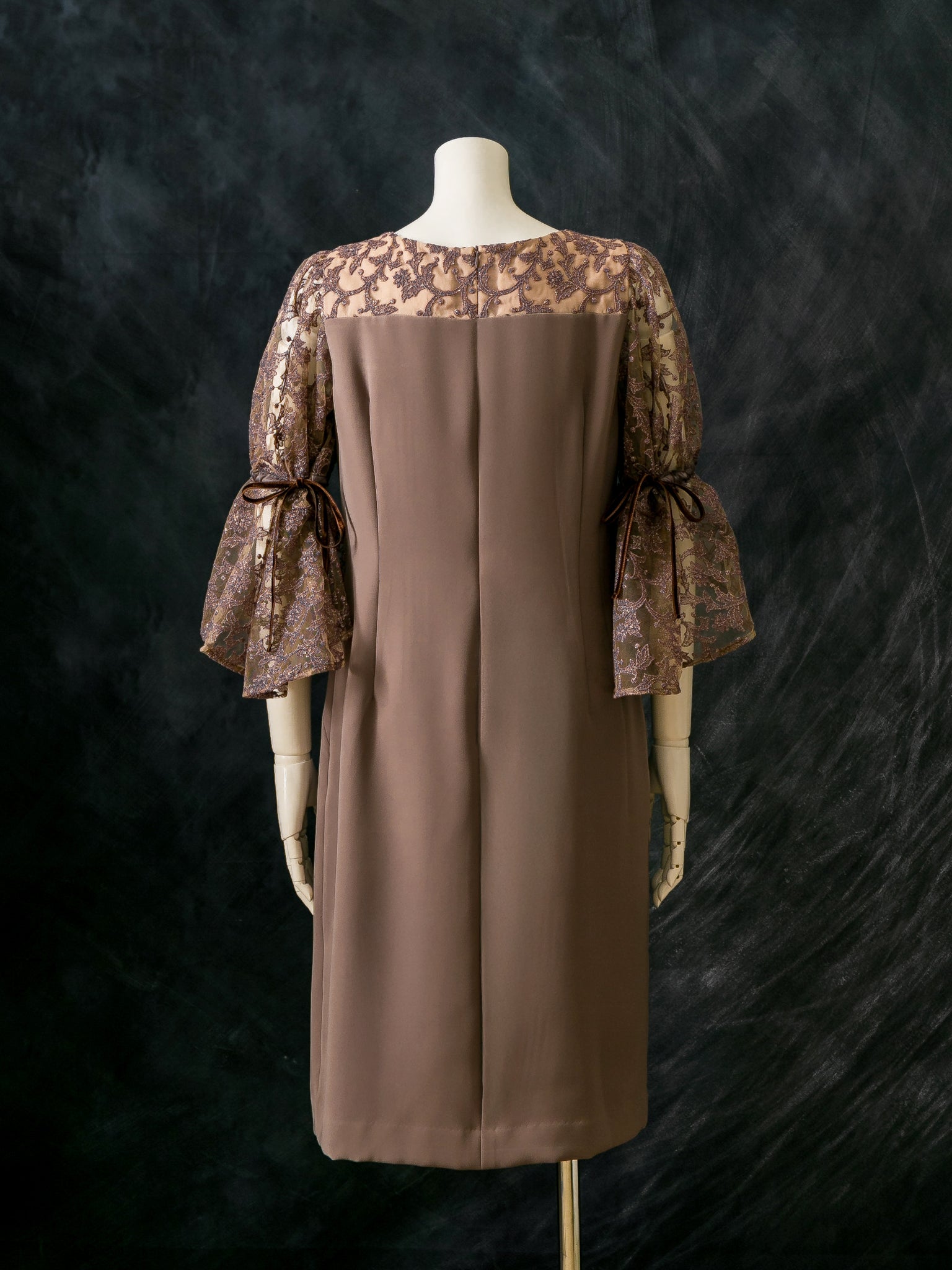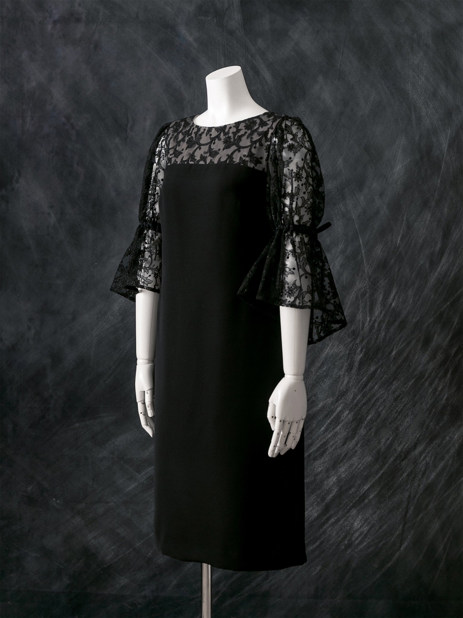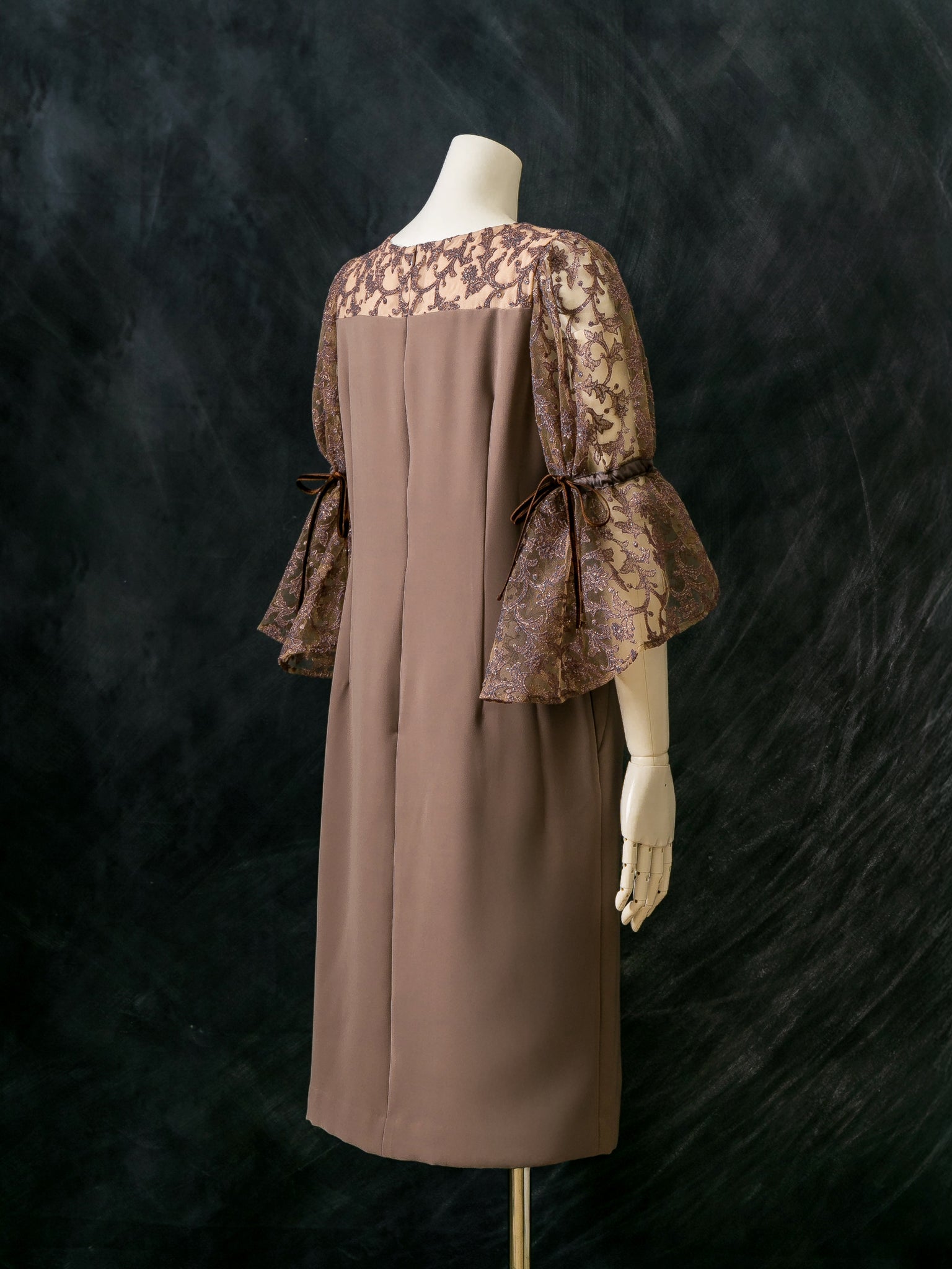 ボディーは膝下丈でコンパクトに袖はボリュームを持たせました。袖のリボンテープを縮めて分量調節することもできます。