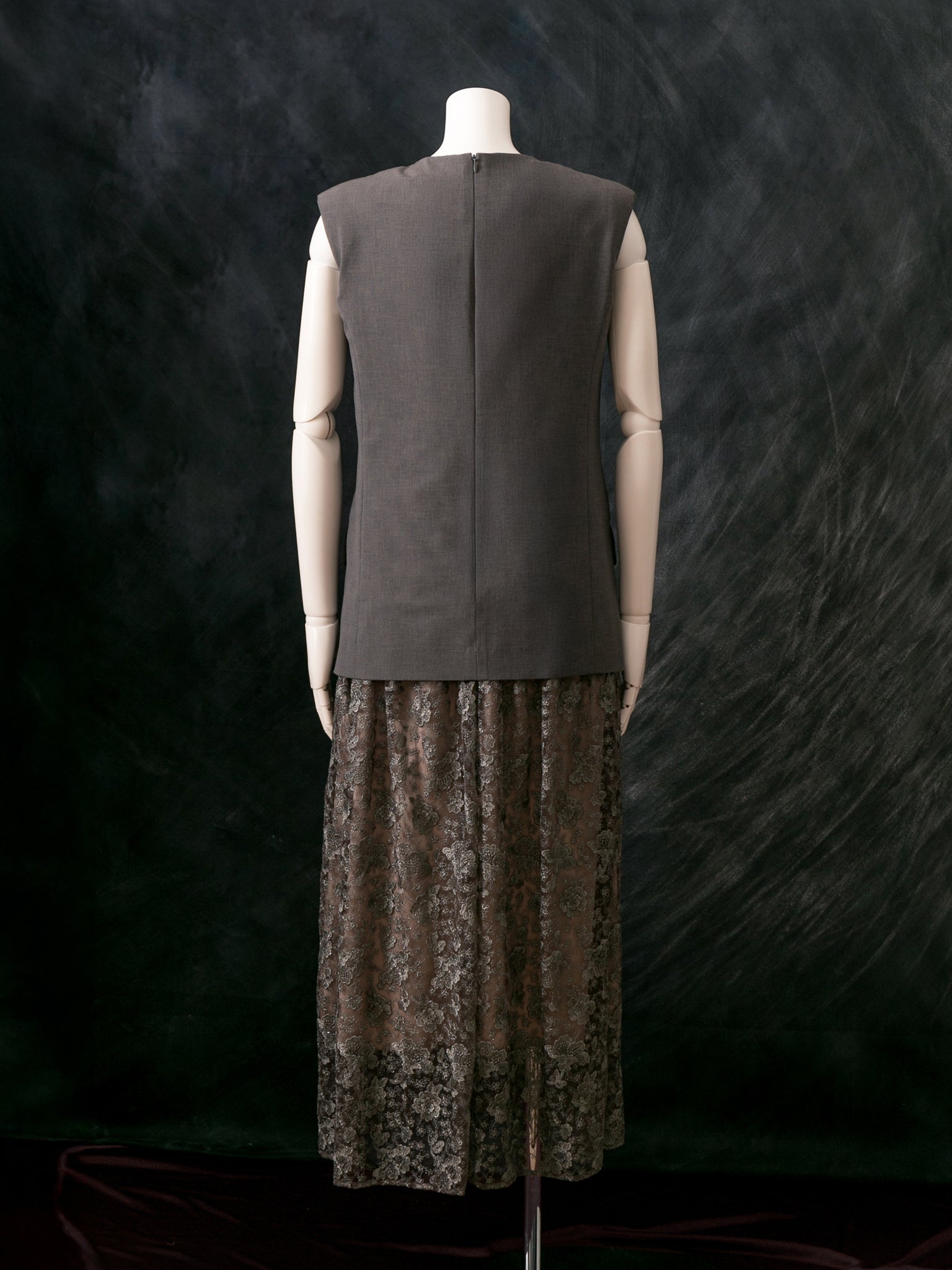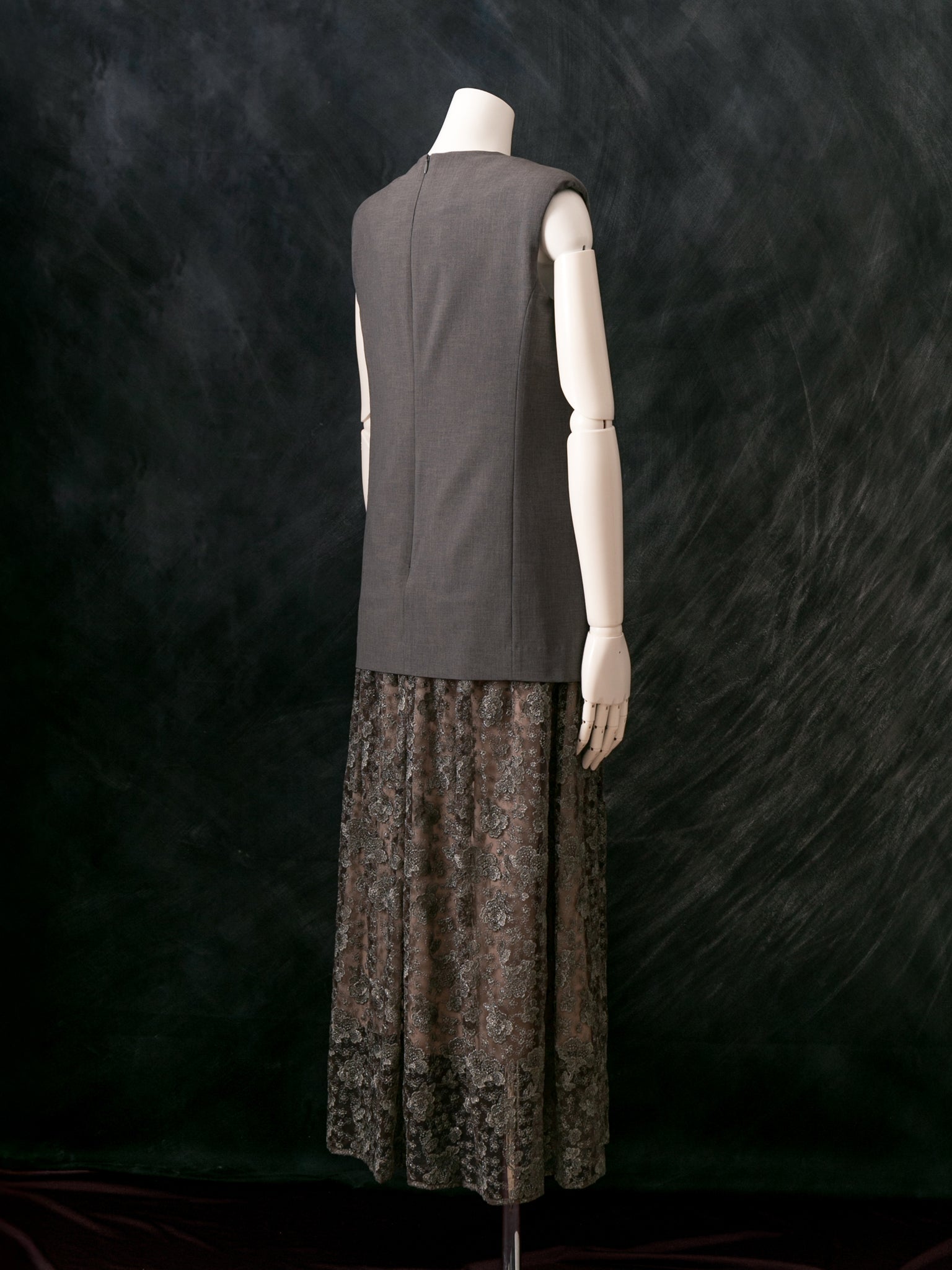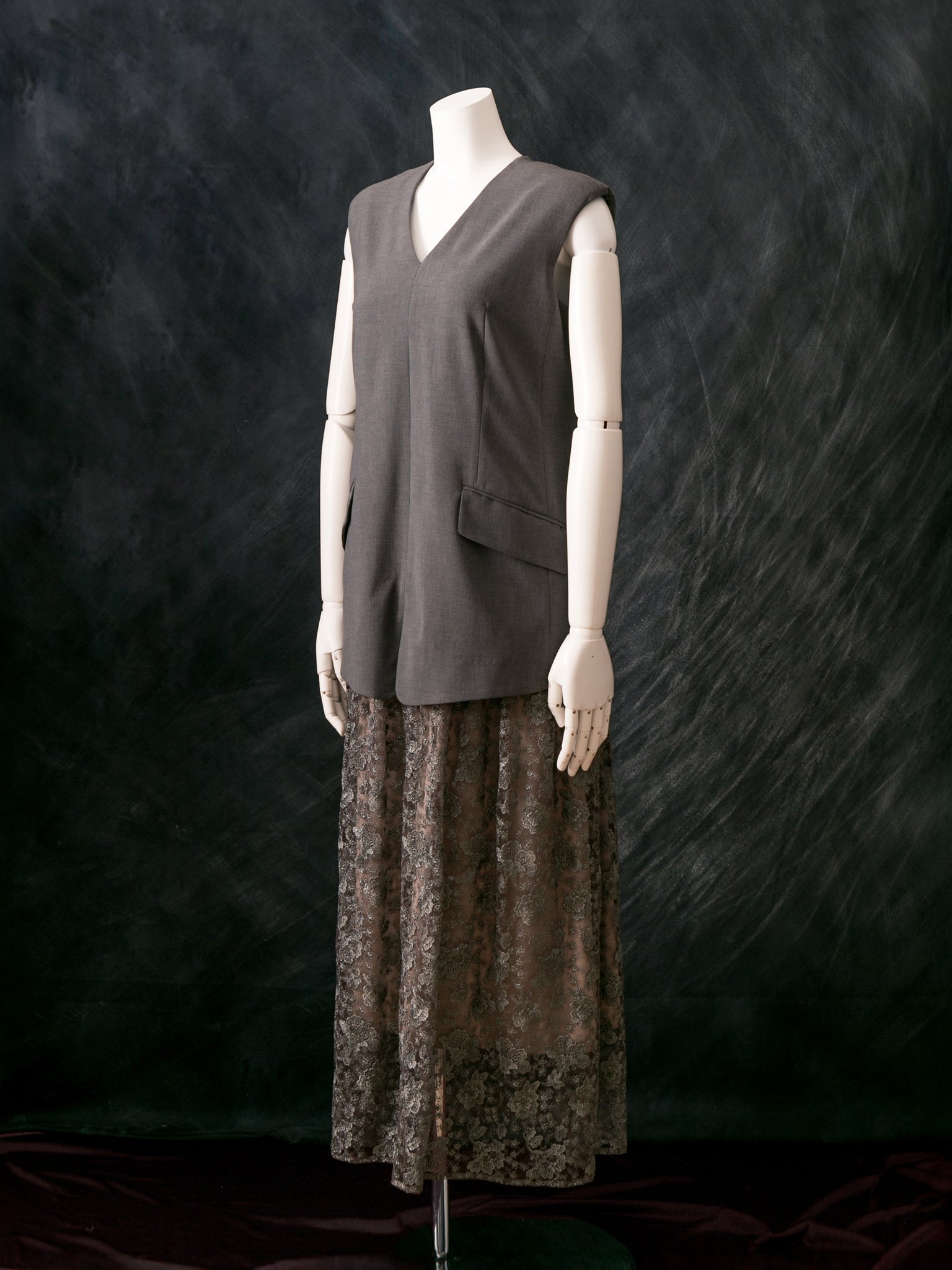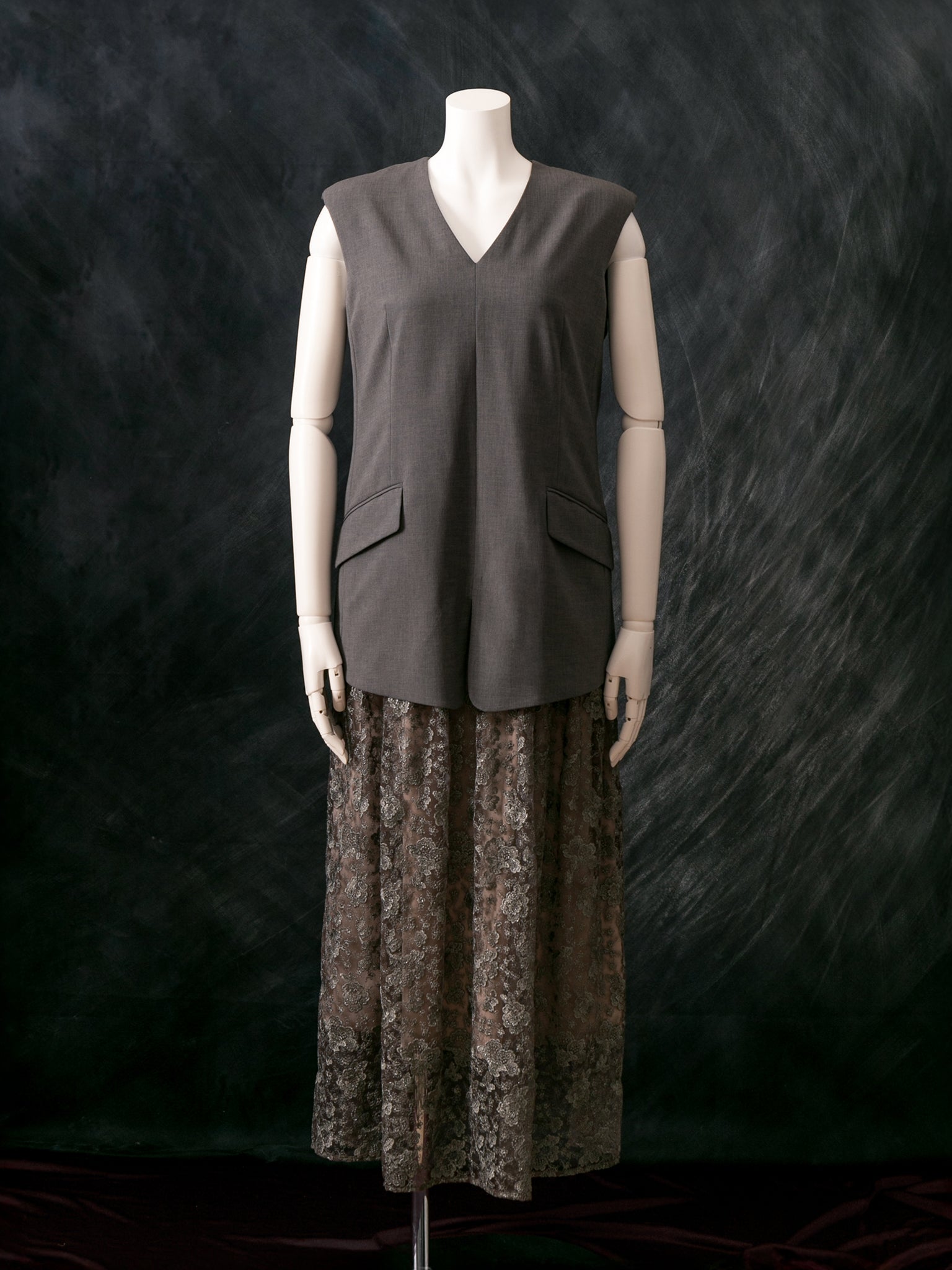 マニッシュなジレスタイルに、レースを贅沢に使ったギャザースカートのドッキング型ドレス。