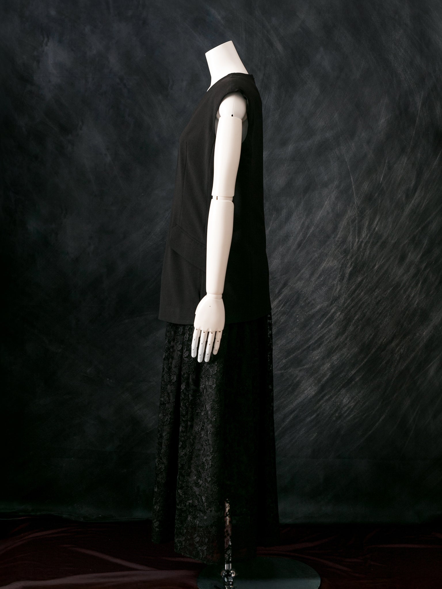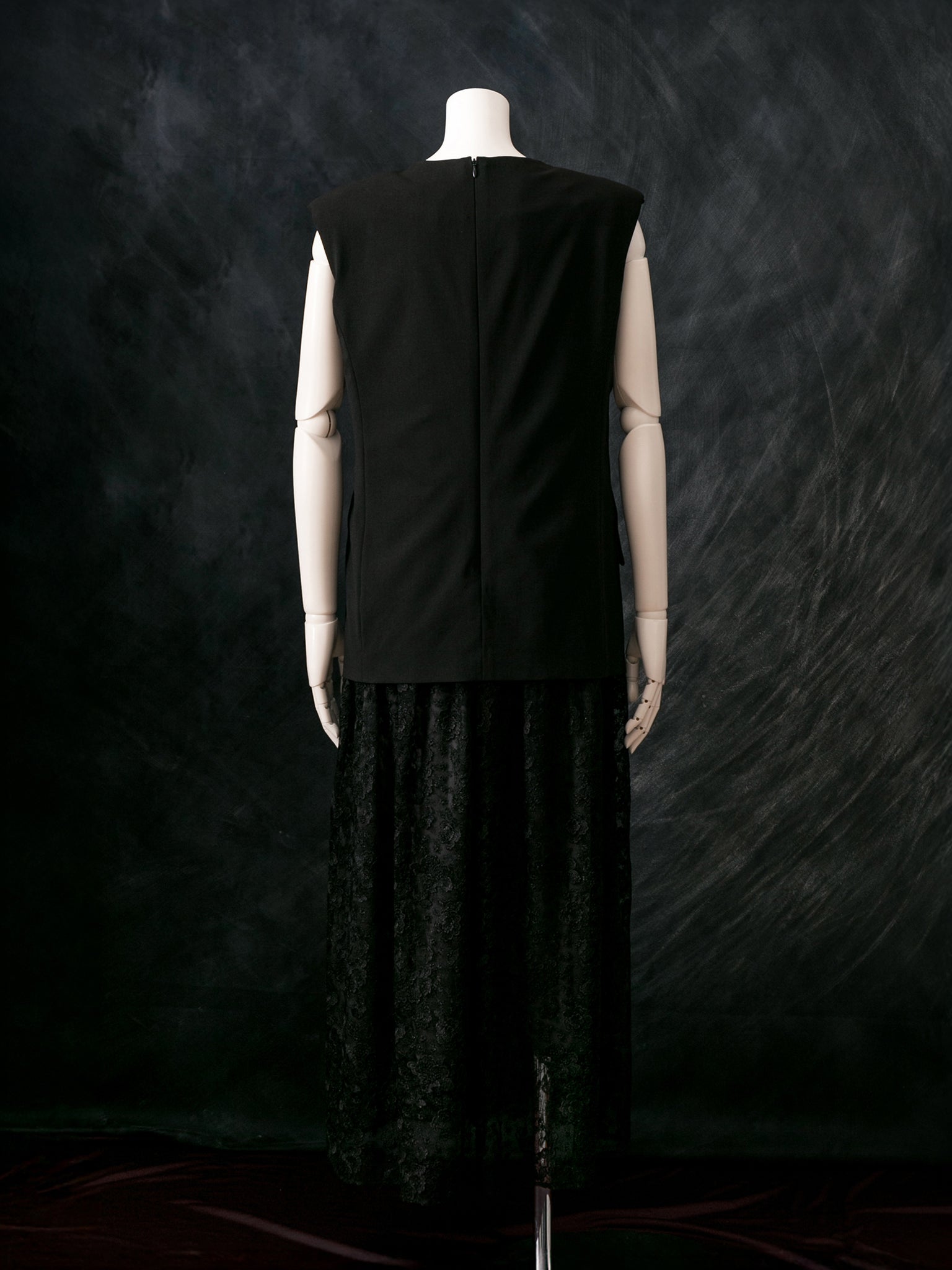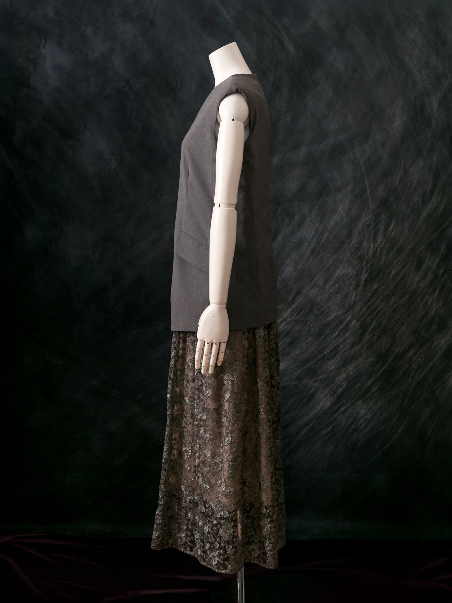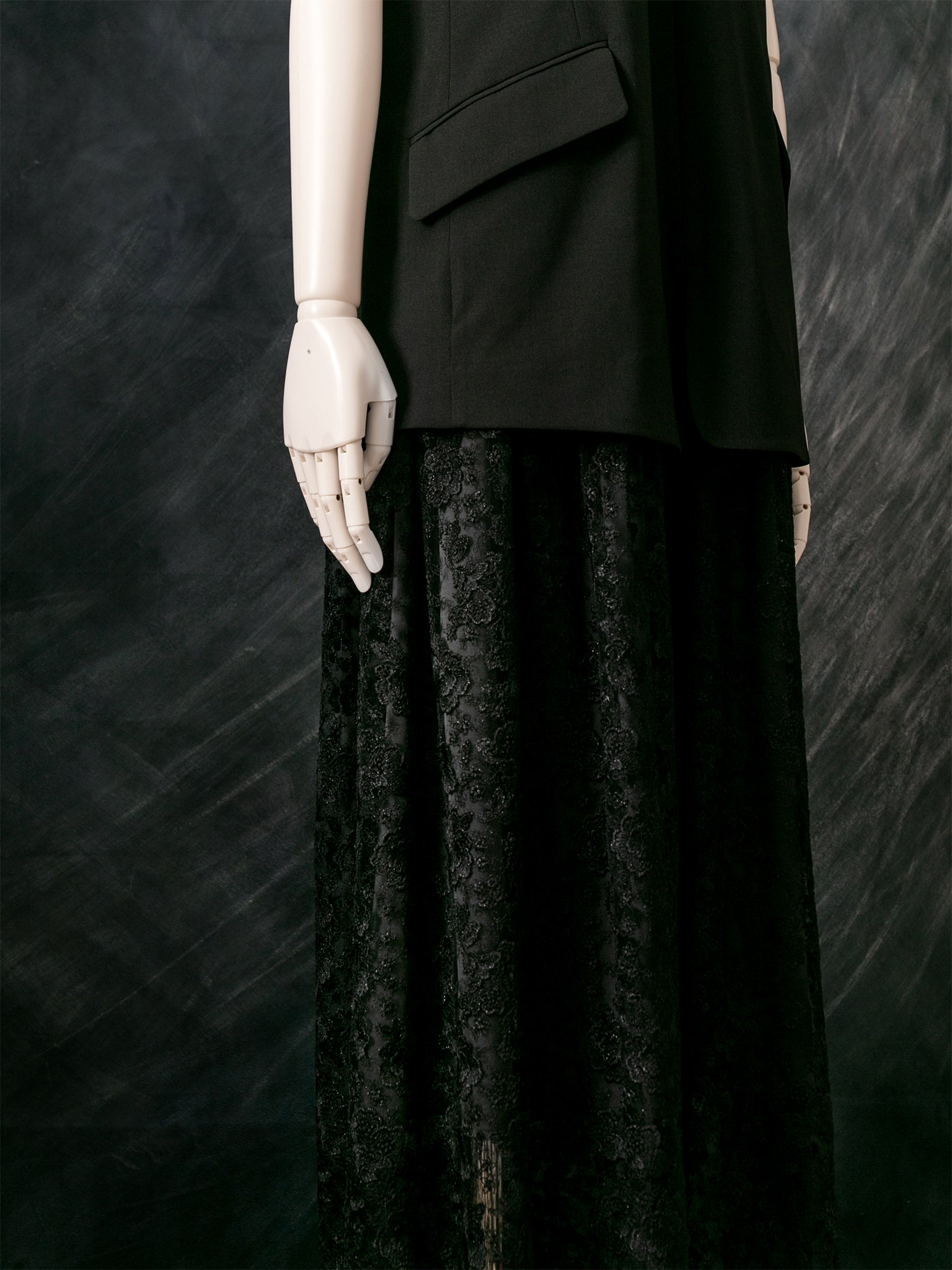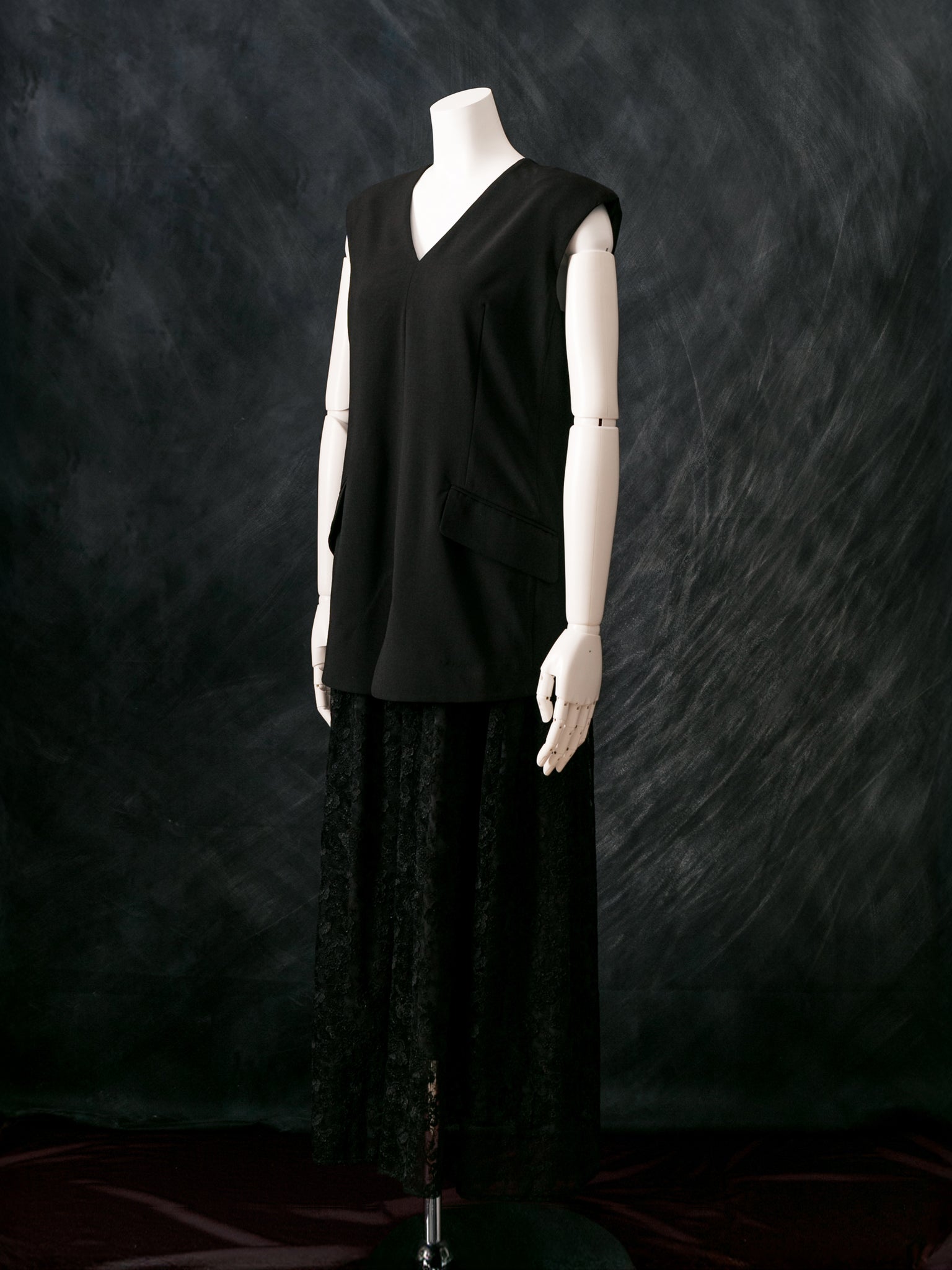 マニッシュなジレスタイルに、レースを贅沢に使ったギャザースカートのドッキング型ドレス。