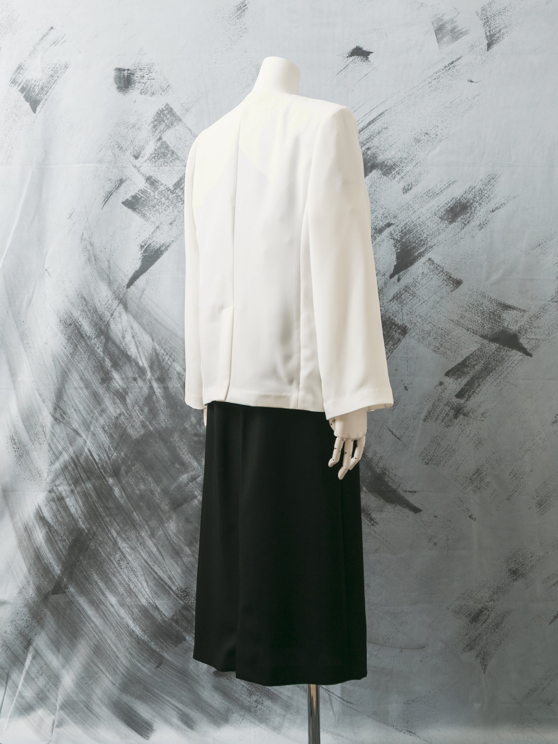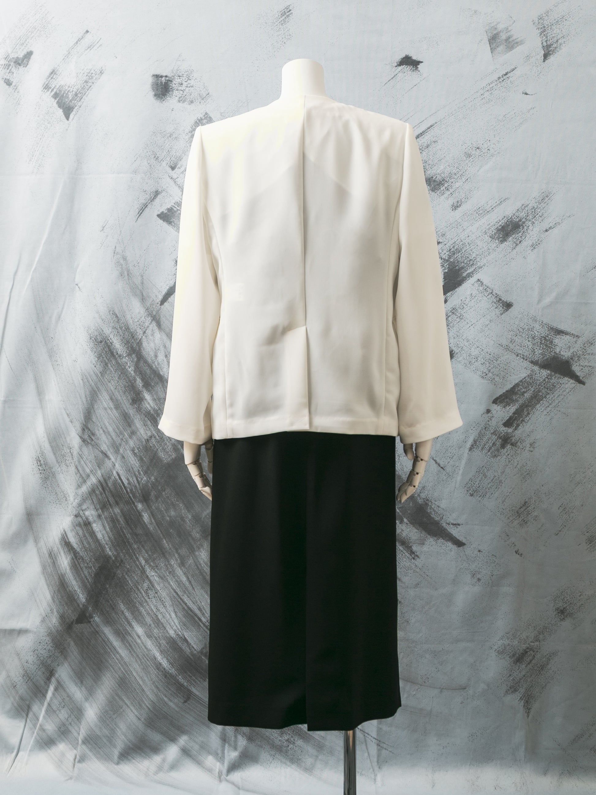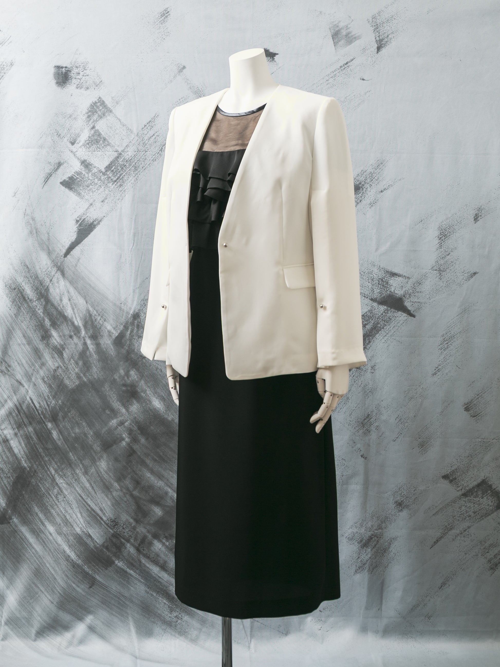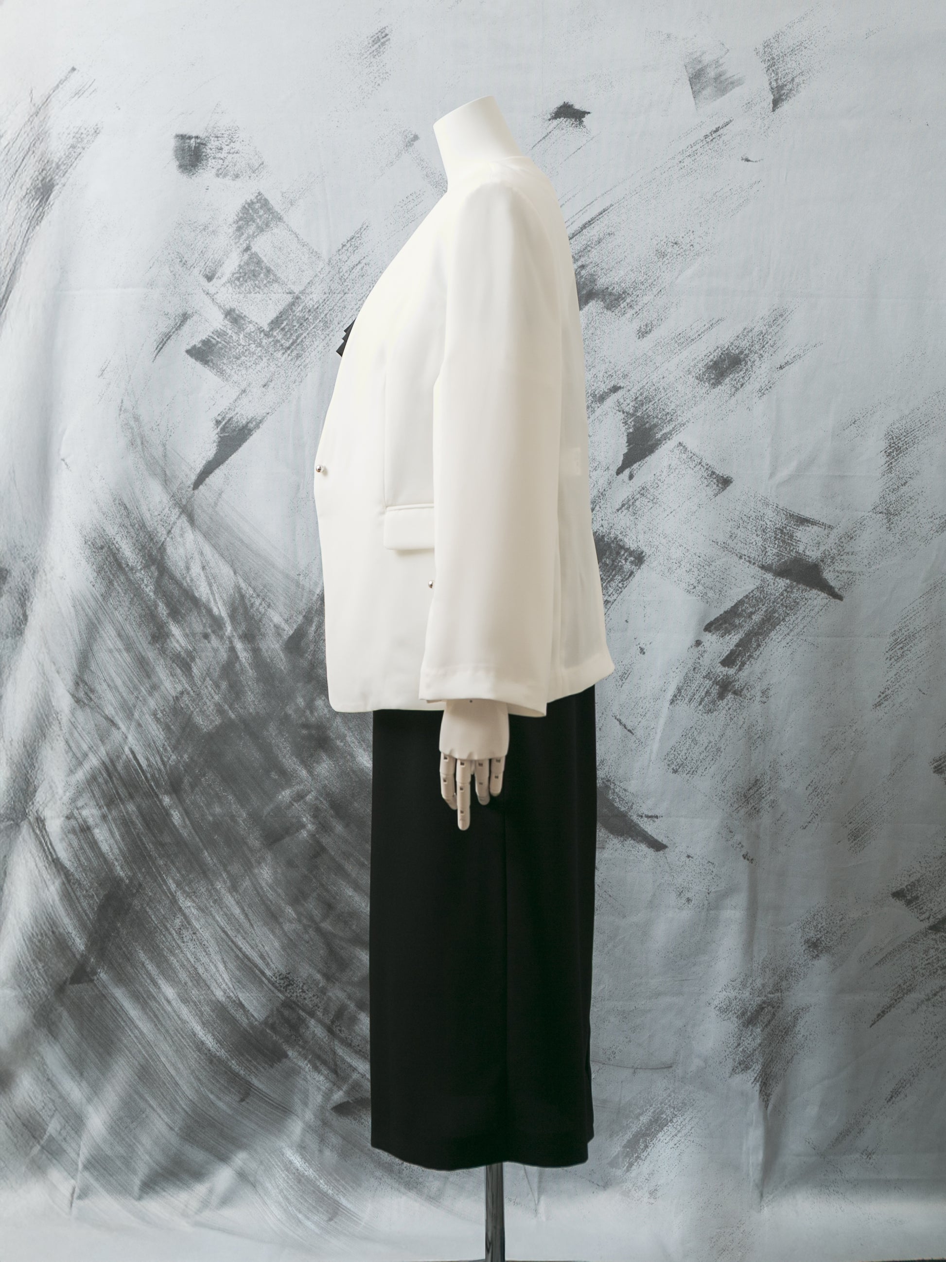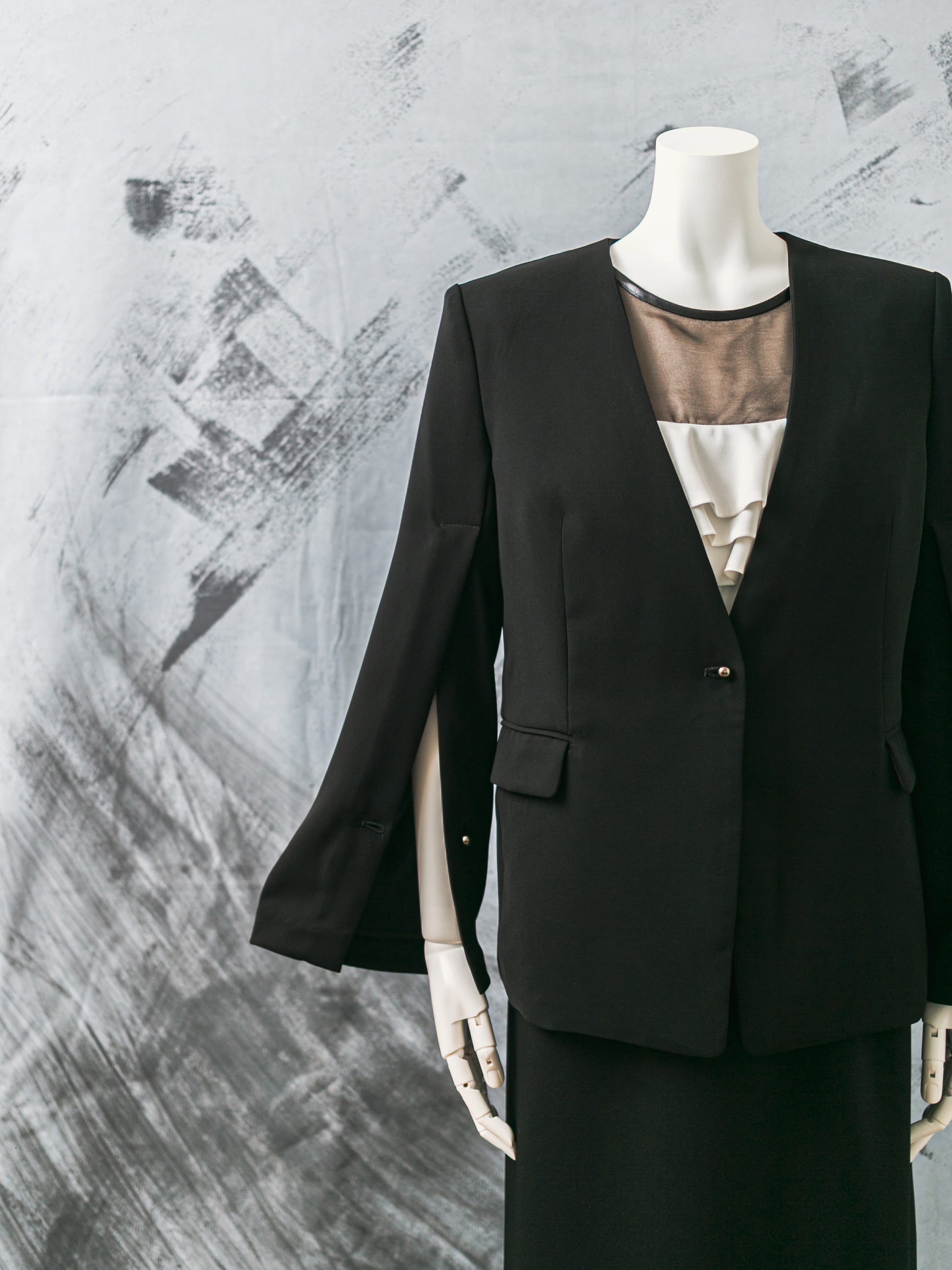 程よい分量にキッチリとした肩先がスタイリッシュ、ノーカラーの襟元でスッキリと見せるノーブルで上品なジャケット。