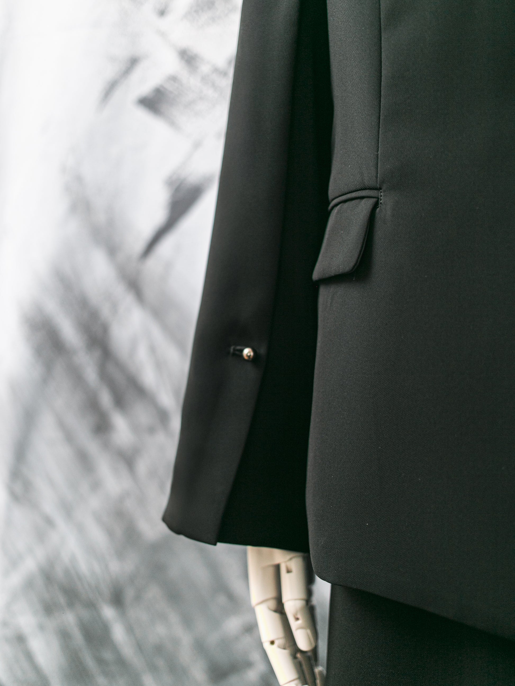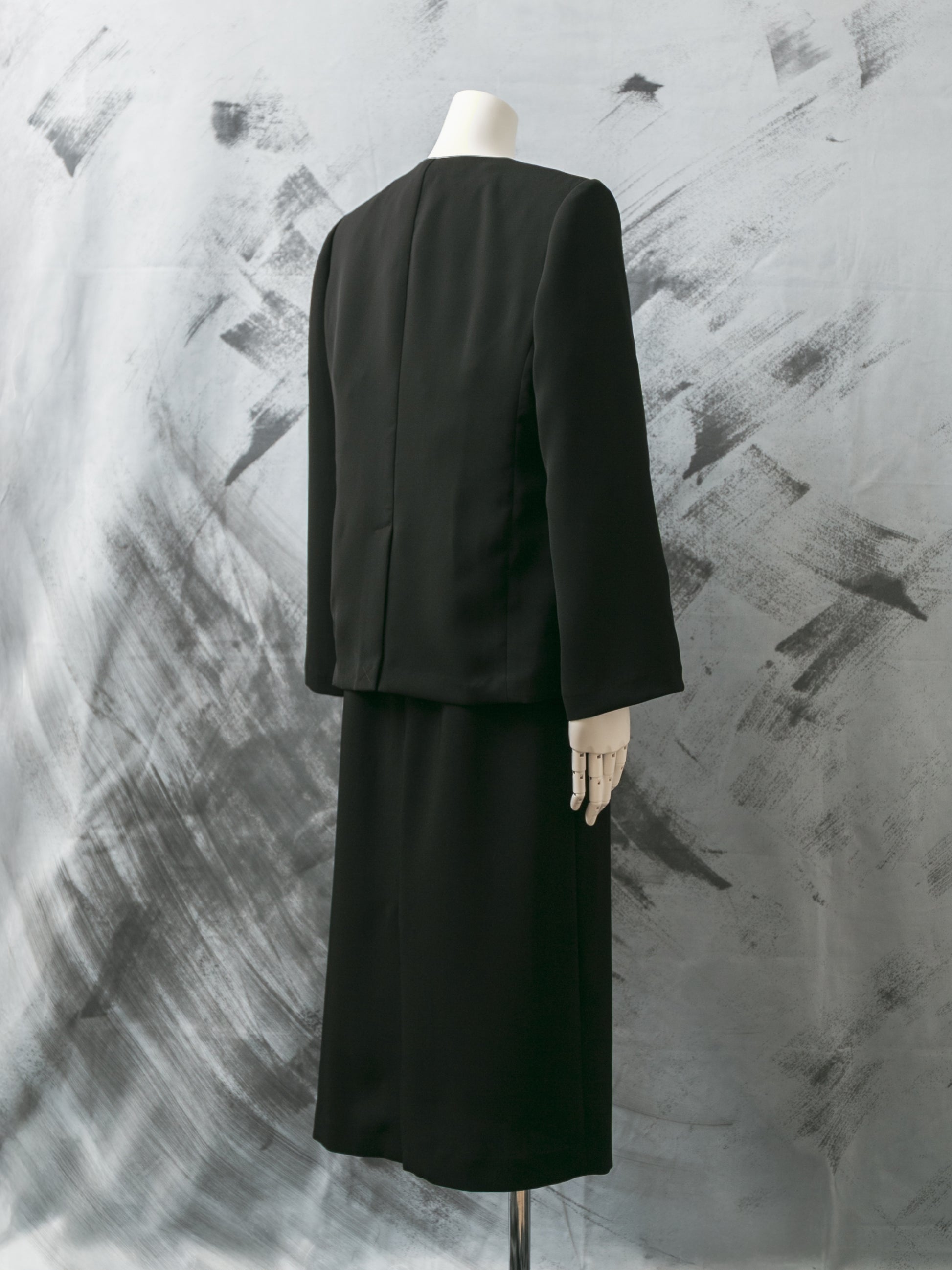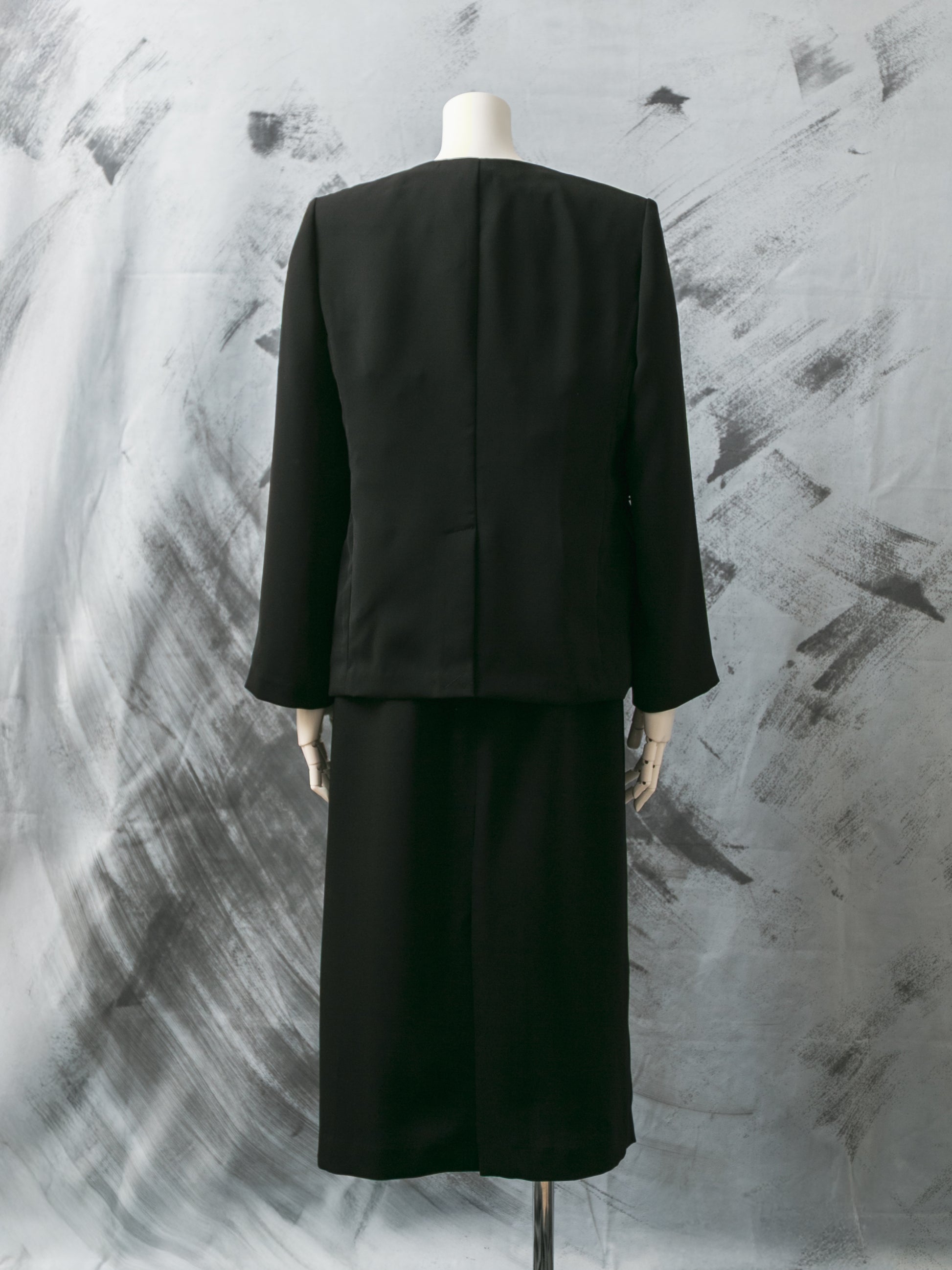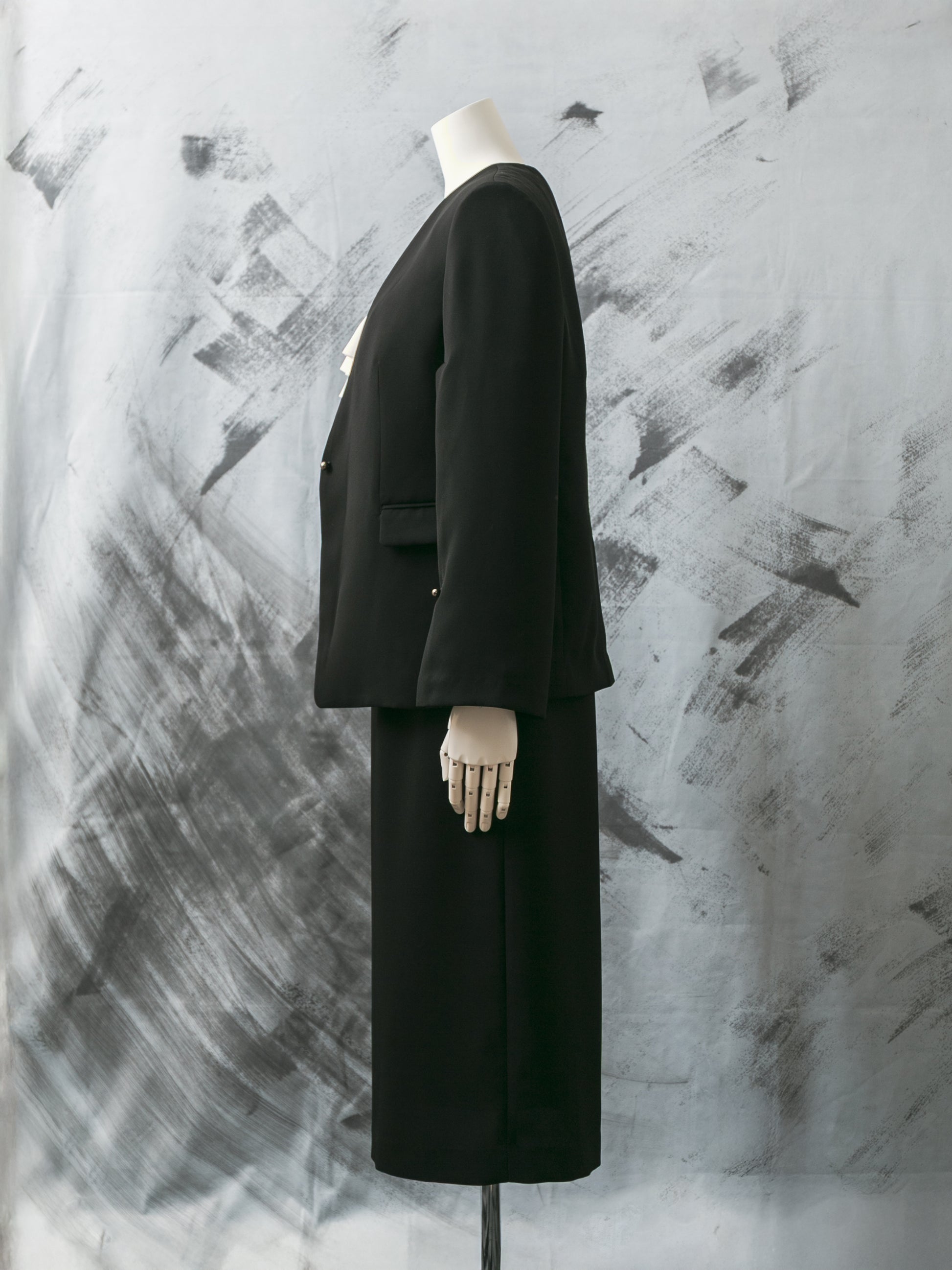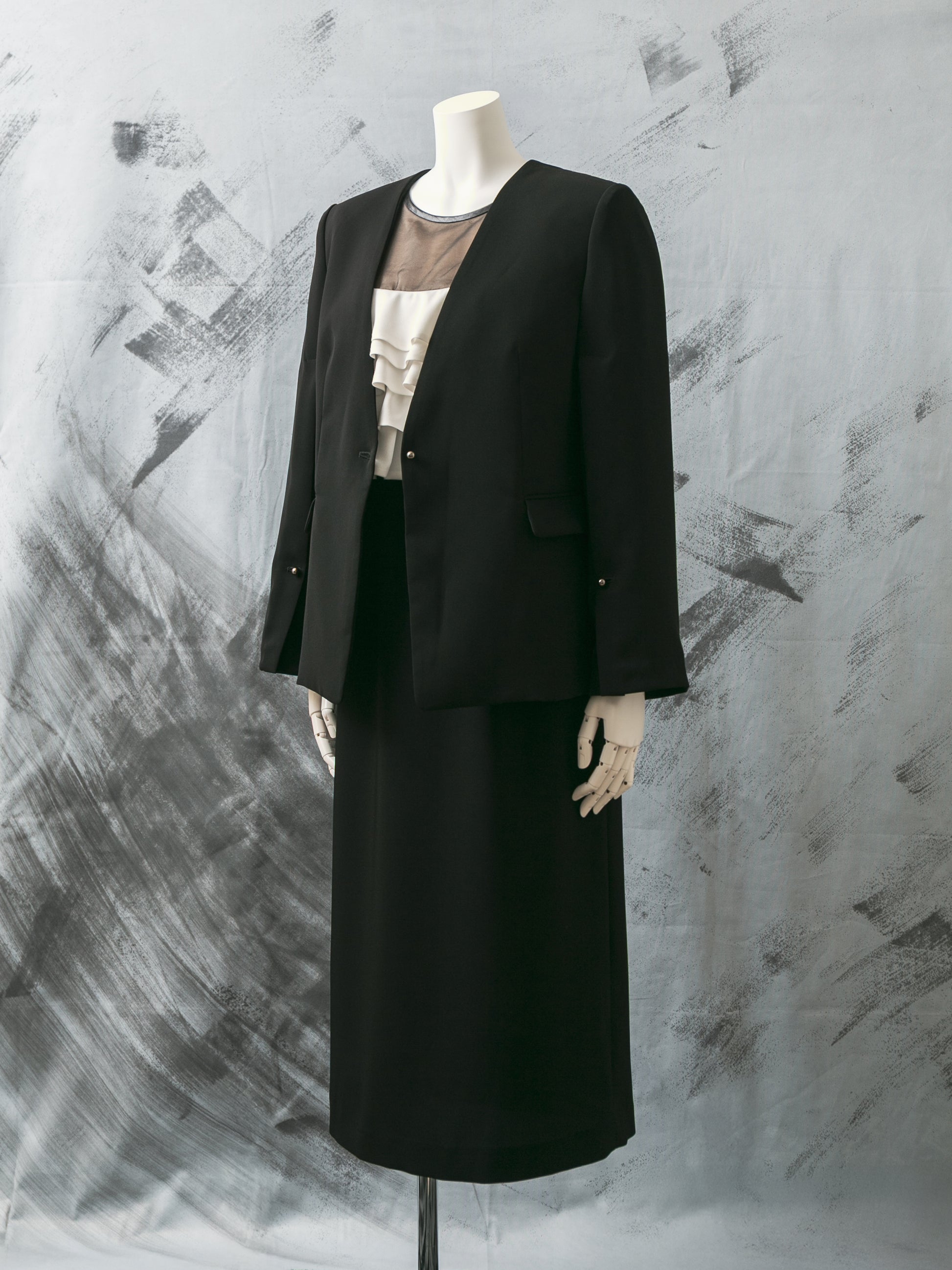 程よい分量にキッチリとした肩先がスタイリッシュ、ノーカラーの襟元でスッキリと見せるノーブルで上品なジャケット。